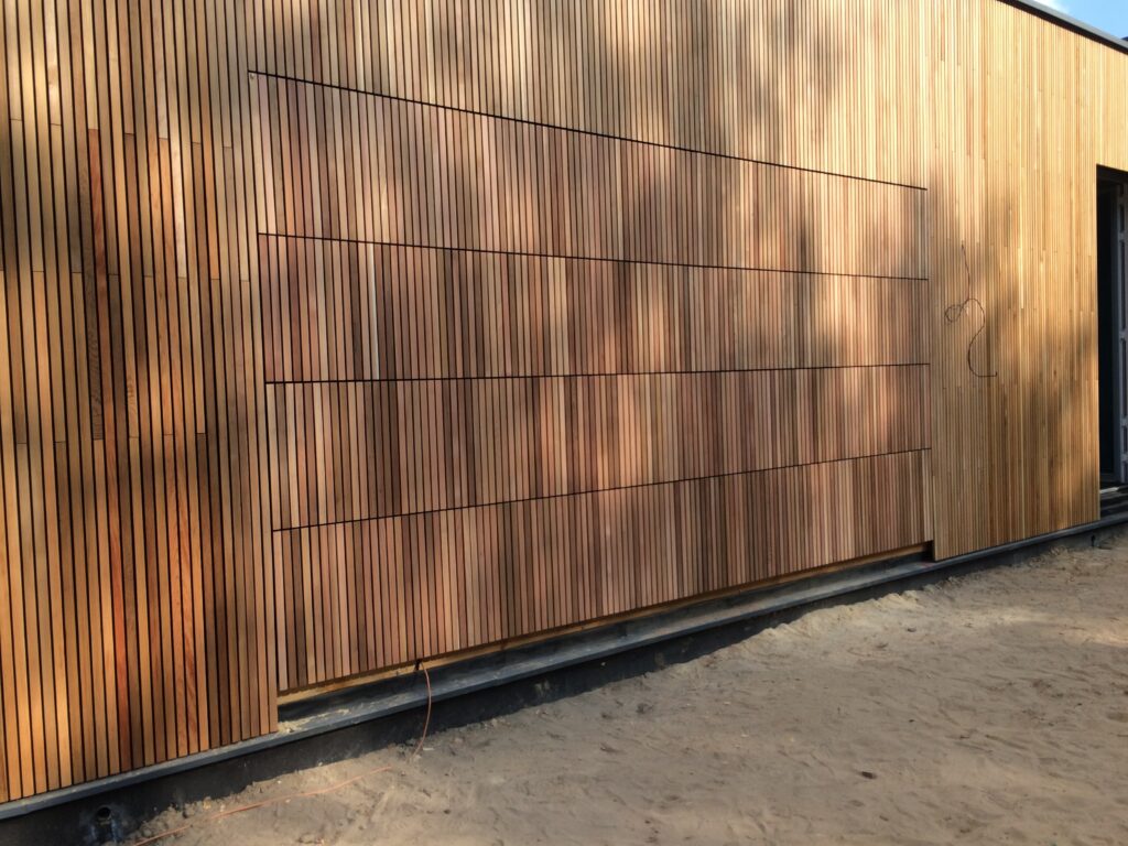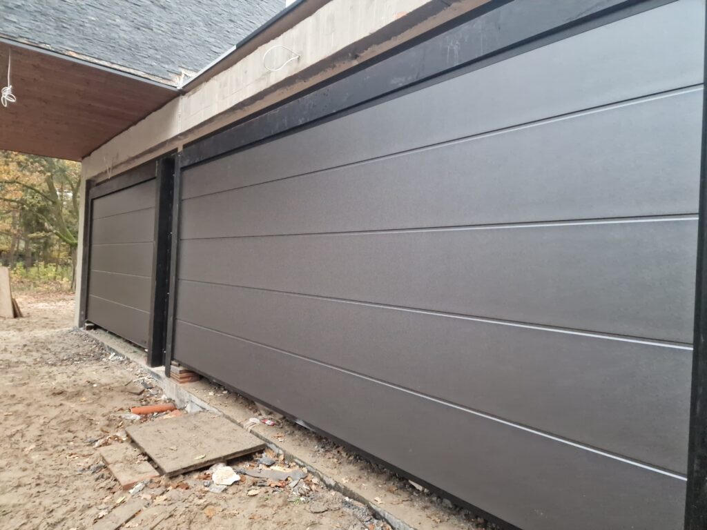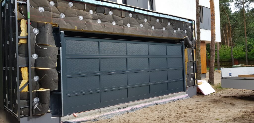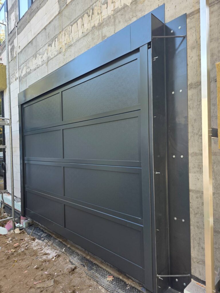 Zdarzało nam się również montować tradycyjne bramy w elewacji. Efekt jest mniejszy ponieważ kolor bramy jest inny niż elewacji. Jest też różnica płaszczyzny elewacji i bramy min 3-4 cm.